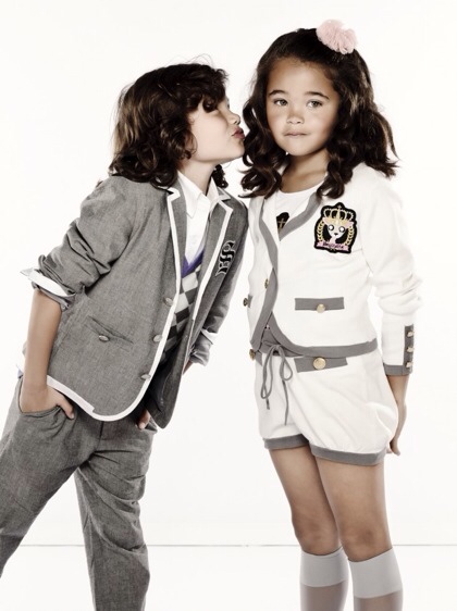 Moda infantil con un estilo elegante, nos recuerda por un lado a Chanel, a los uniformes de colegio con emblemas pero con muchos detalles actuales, combinaciones arriesgadas de colores, ribetes, botones dorados, americanas con solapas…